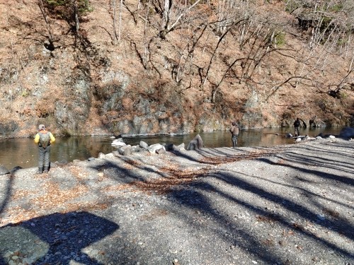 群馬県上野村 冬季マス釣り場 ( ハコスチ ) 釣り人が沢山